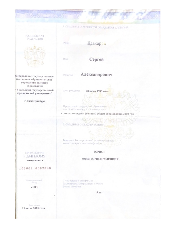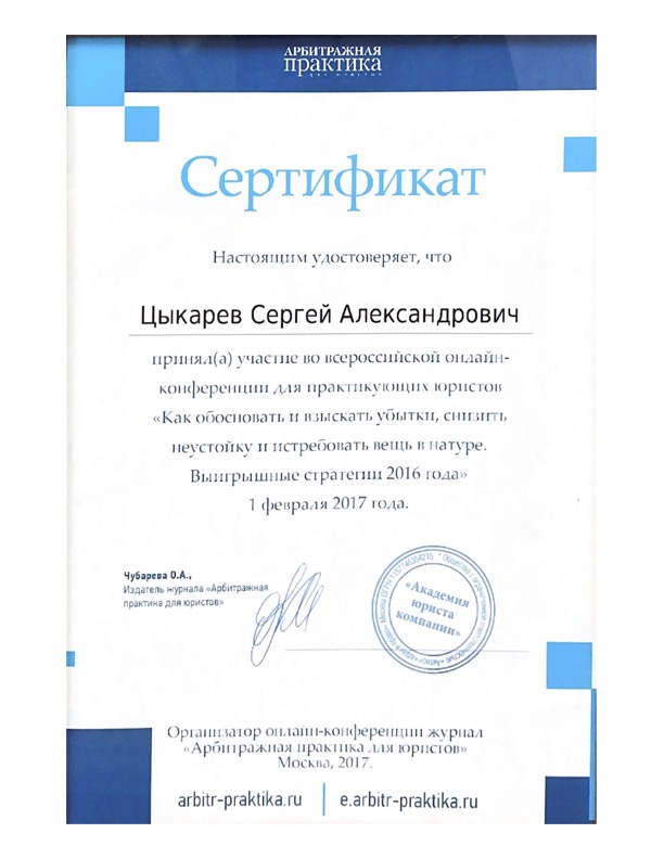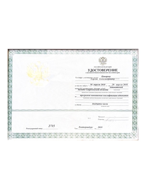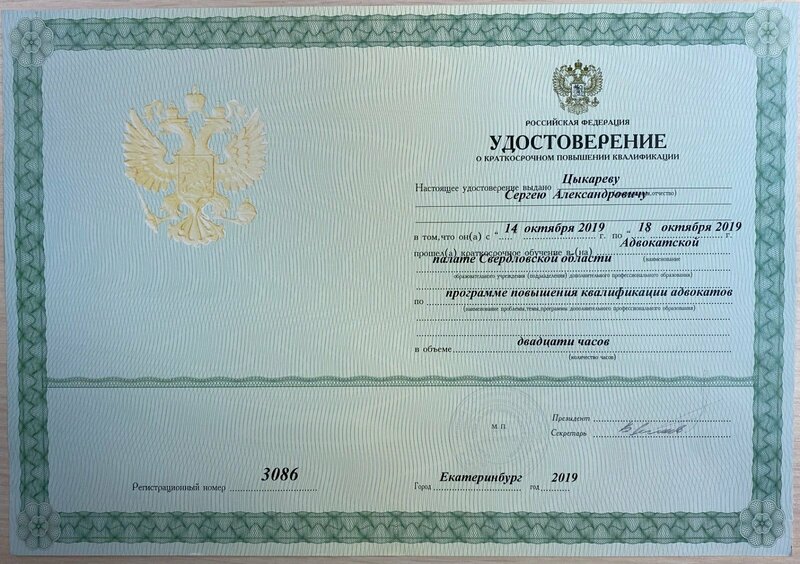 Адвокат осуществляет деятельность в Адвокатском кабинете «адвокат Цыкарев Сергей Александрович» состоит в Адвокатской палате Свердловской области реестровый номер адвоката N° 66/3085.